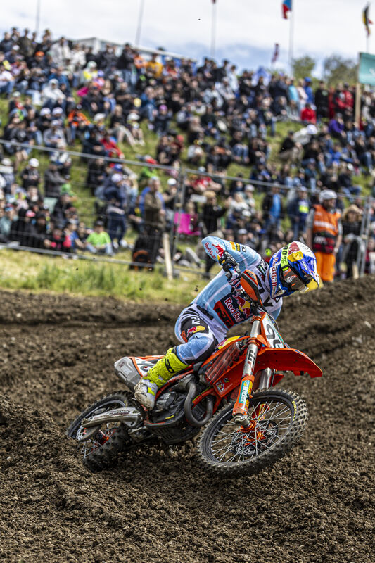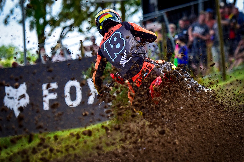 Tras una intensa lluvia, al inicio de la segunda manga de MX2 vimos el dominio de Sacha Coenen hasta que sufrió una fuerte caída y cedió el liderato a Guillem Farrés. El piloto español consiguió su primera victoria en una manga de MX2 y subió al podio en segunda posición, mientras que De Wolf remontó hasta el segundo puesto y Adamo el tercero, ¡lo suficiente para ganar el GP y ponerse primero en la provisional del campeonato!