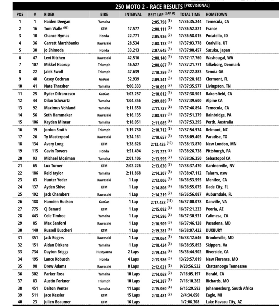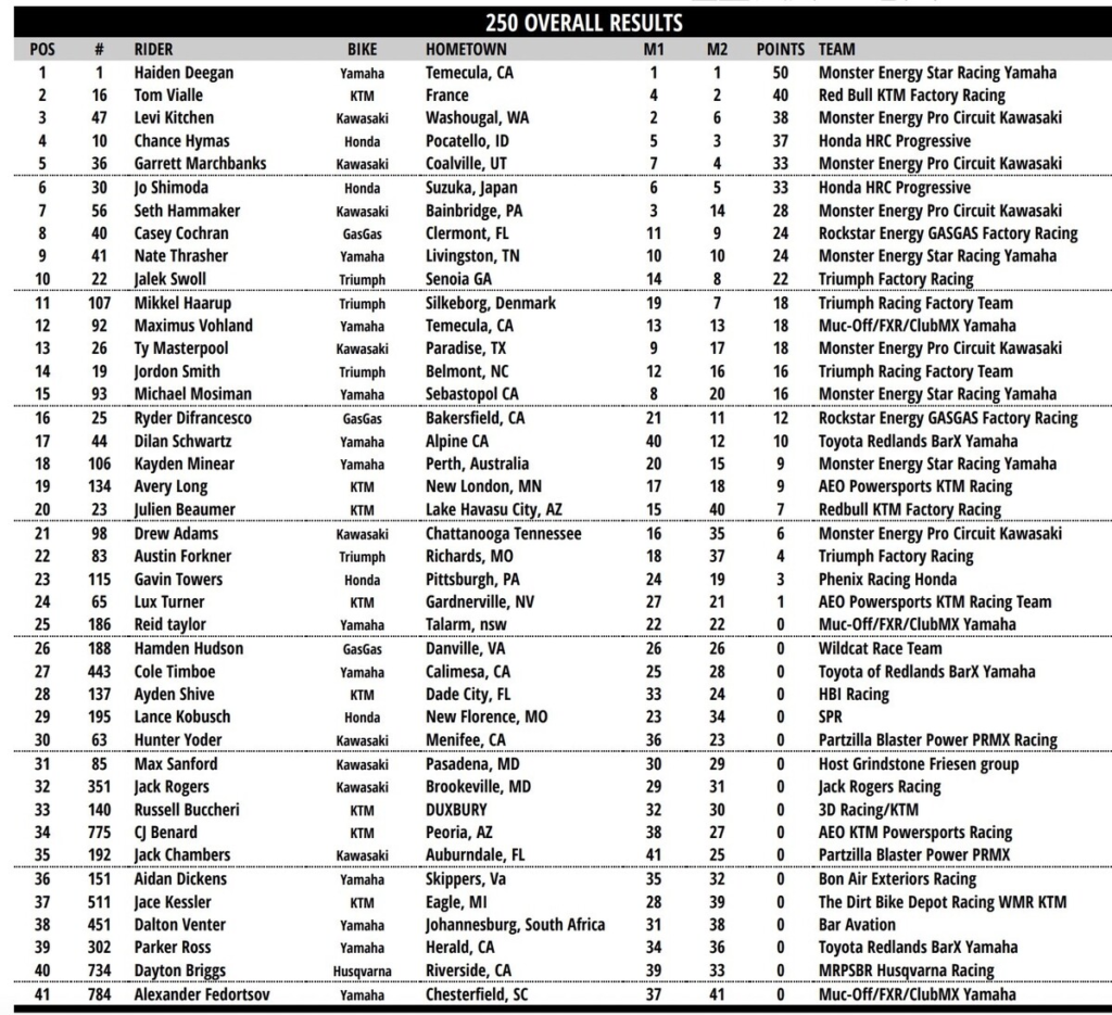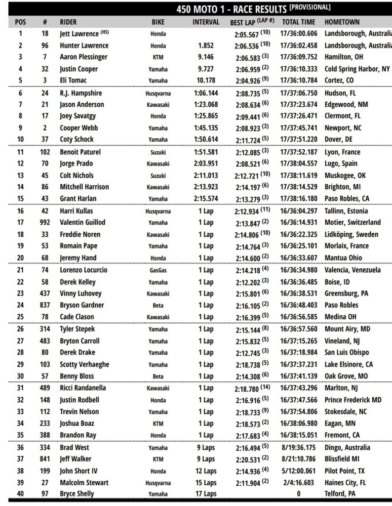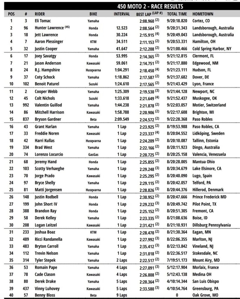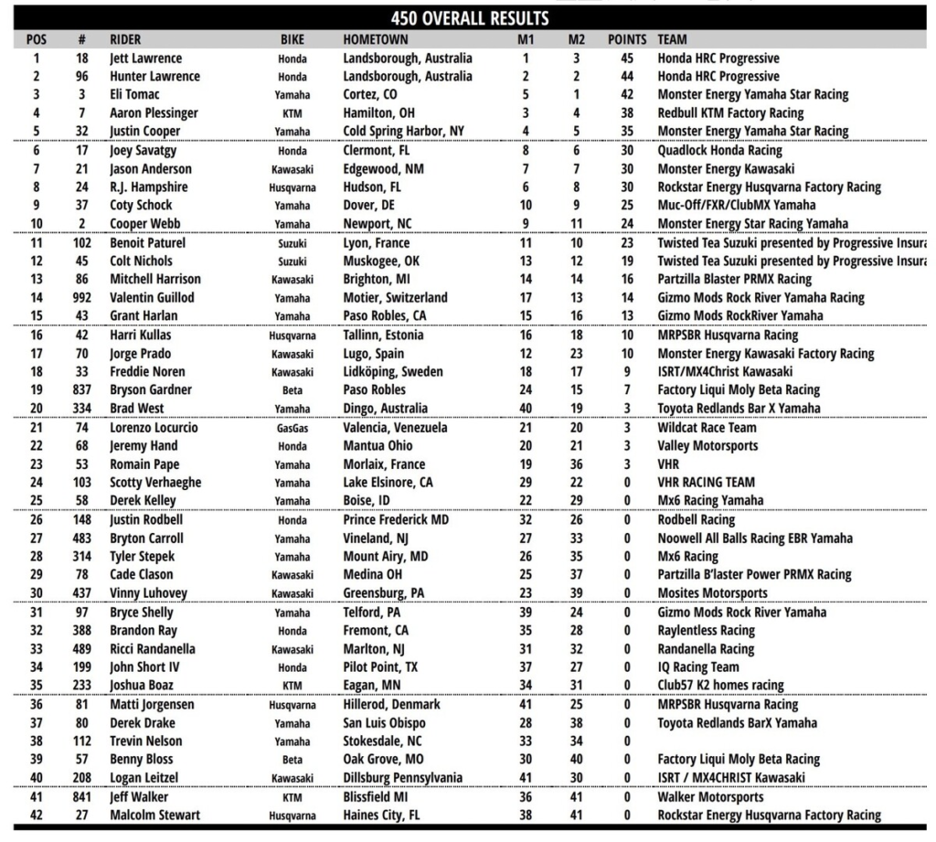 Como Jett llego 3º en la segunda manga se llevo la victoria en la general, 2º Hunter y 3º Tomac. Prado acabo el 23º con mucho trabajo por hacer para tener la moto a su gusto, así que ya veremos la próxima.