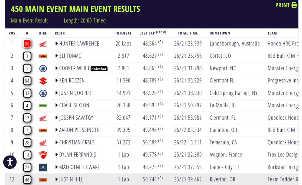 Hunter Lawrence consiguió su primera victoria en un Supercross de 450 de su carrera, remontando y teniendo que batallar duramente con Ken Roczen, Tomac también remonto para acabar en segunda posición, Webb completo el podio.