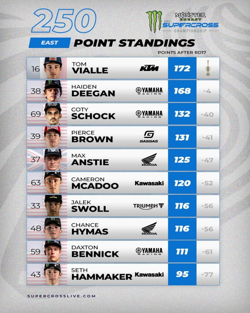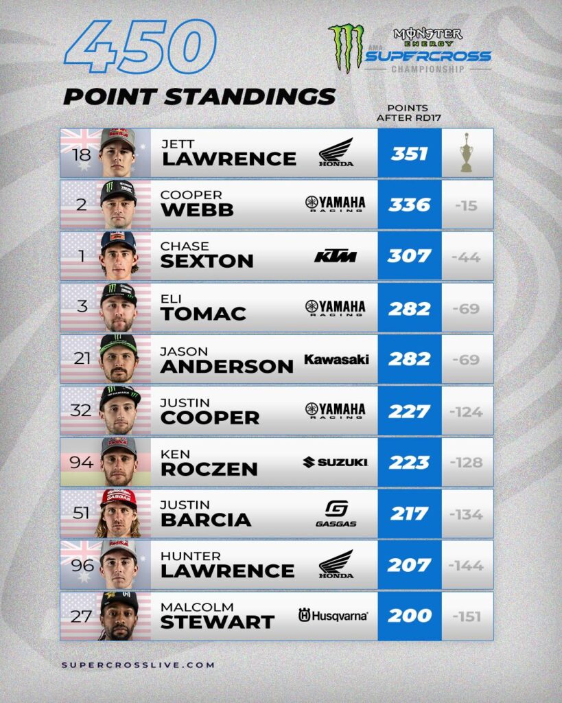 Puede ser una imagen de 10 personas y texto que dice "250 M- BERAY EK CHAMPIONSHIP WEST WEST POINT STANDINGS POINTS AFTER RD17 24 HAMPSHIRE RJ Husqvarna 47 208 LEVI KITCHEN 31 Kawasaki 203 -5 JORDON SMITH YAMAHA 30 185 SHIMODA JO -23 57 HONDA 181 -27 NATE THRASHER 전으년! YAMAHA 26 123 -85 GARRETT MARCHBANKS YAMAHA 929 121 -87 JULIEN BEAUMER 100 118 -90 ANTHONY BOURDON SUZUKI 36 106 -102 PHILLIP NICOLETTI 6奇うを DYAMAHA e 105 -103 COLE THOMPSON YAMAHA 89 SUPERCROSSLIVE.COM -119"