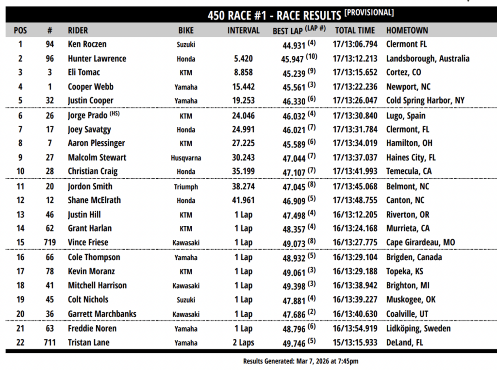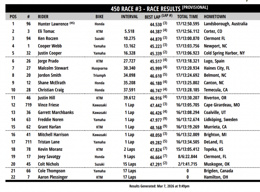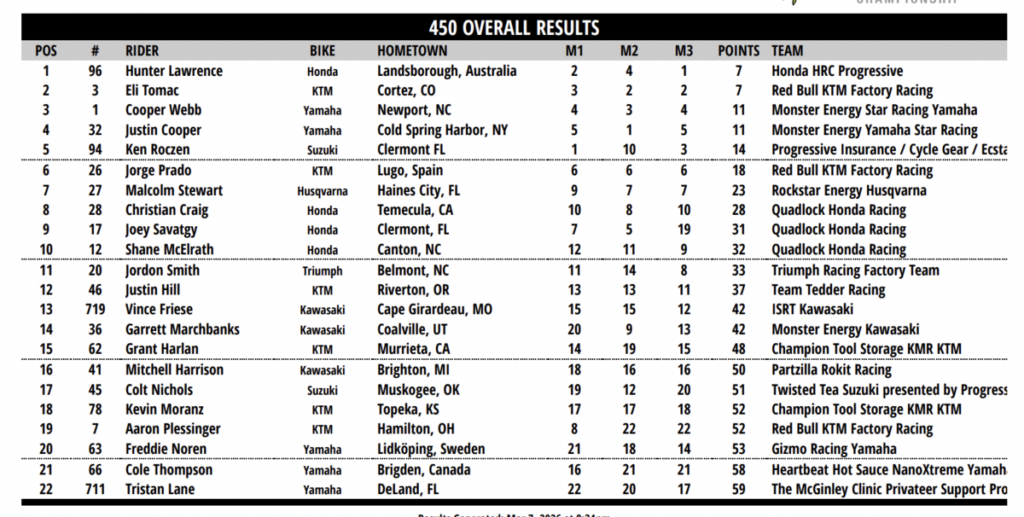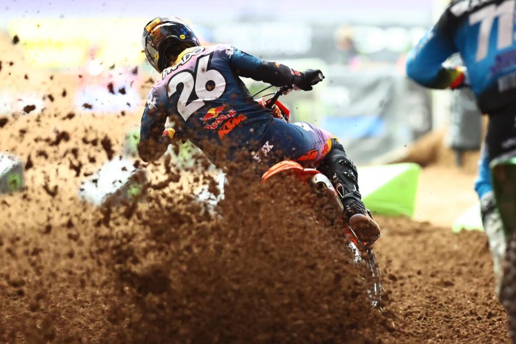 Eli Tomac: «Fue una buena noche en general. Cometí un error en la Carrera 3, lo que permitió a Hunter [Lawrence] sacar un segundo o dos de ventaja, que simplemente no pude recuperar. Me alegro de salir de aquí en P2 porque este lugar hace que sea una noche de carreras realmente difícil con el formato de la Triple Corona, así como el suelo, así que estaba deseando que llegue la semana de descanso».
