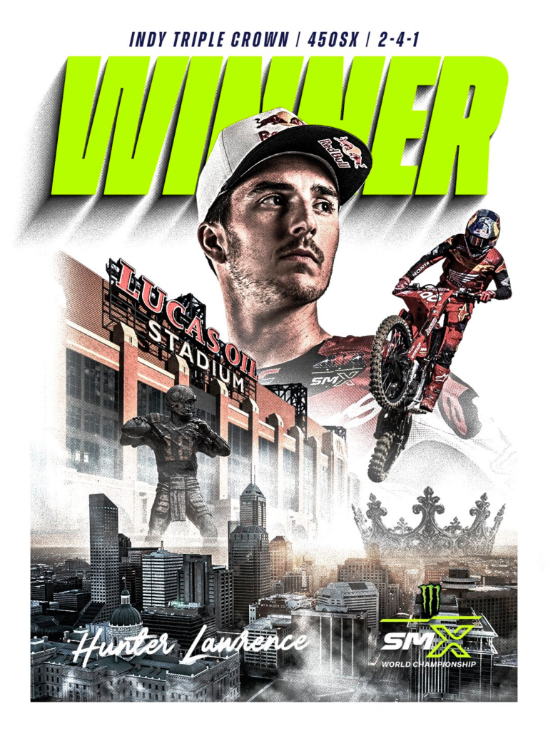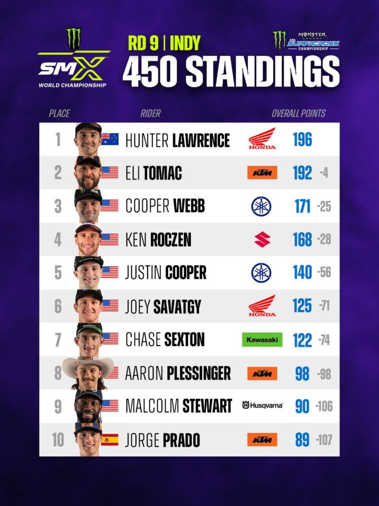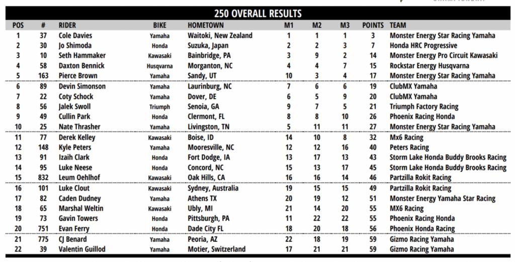 Hunter domino en primera posición, dejando lejos a Tomac. Roczen acabo tercero, su caída en la segunda carrera le arruino el resultado.