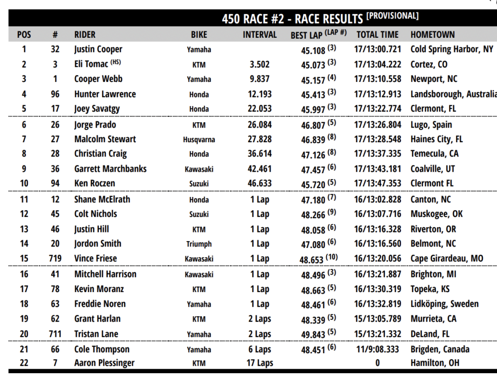 Cuando luego Tomac iba a por JC el doblado Friese se puso por medio y casi le hace caer, al poco Hunter embistió por detrás a otro doblado, a Cole Thompson, sacando de la pista al doblado y el perdiendo bastante tiempo.