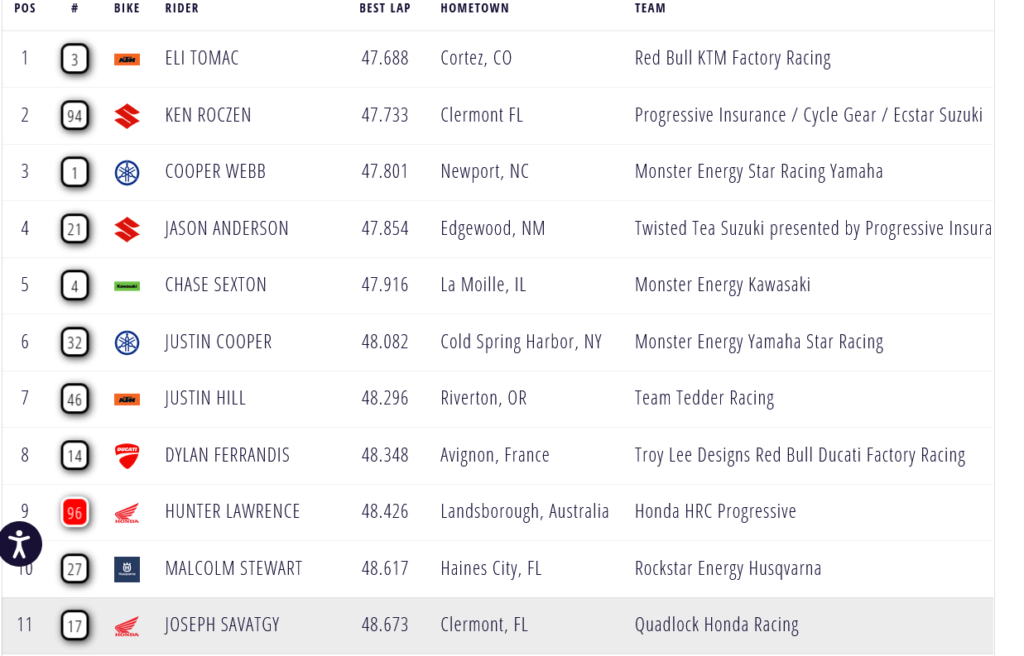 En la Q1 de 450 Malc ha sido el más rápido, seguido de Sexton y Savatgy que han sido los únicos en rodar en 48. Luego hay muchos en 49