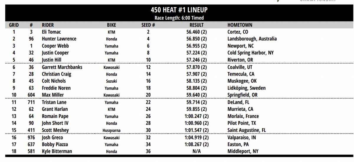 En la Heat 1 de 450, Tomac salía muy bien, marcando una gran ventaja, detrás Craig se disputaba la posición con Hunta, y detrás de ellos, JC y Webb.