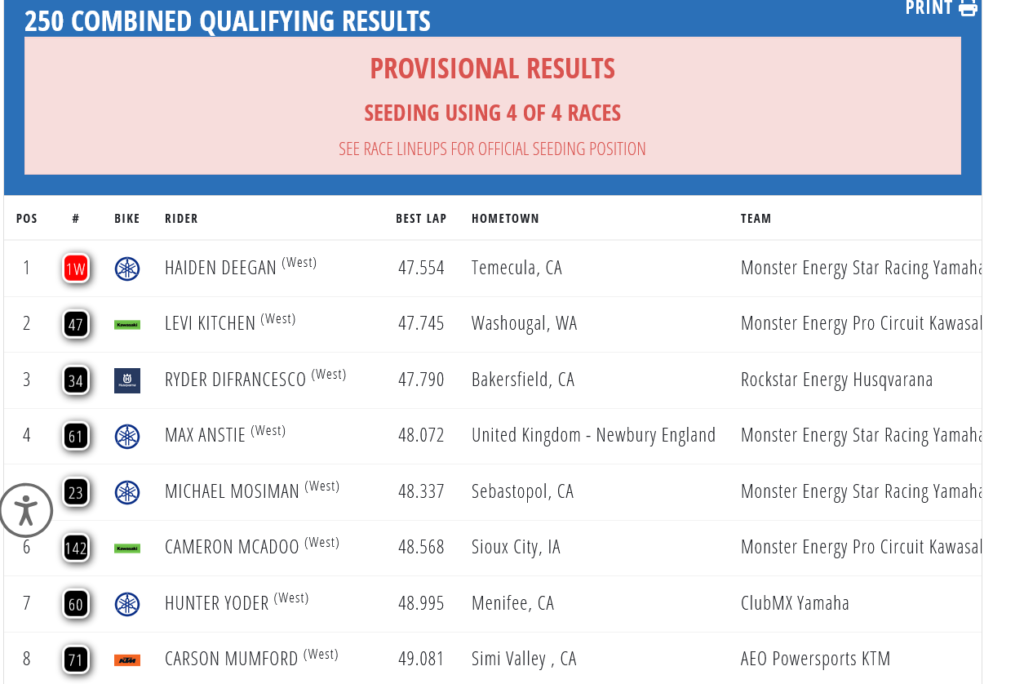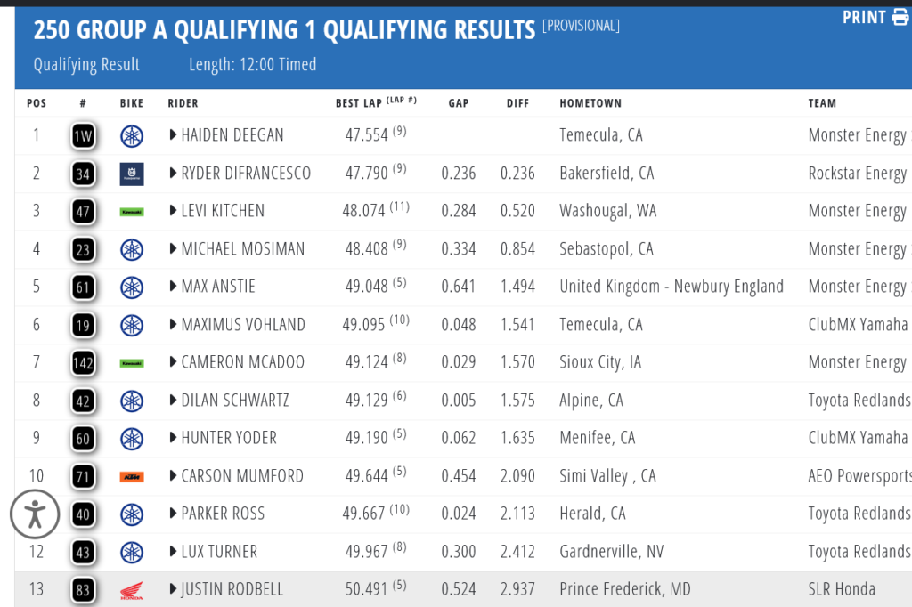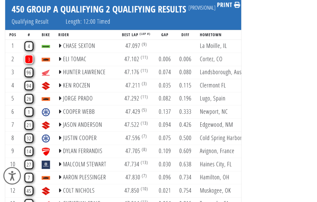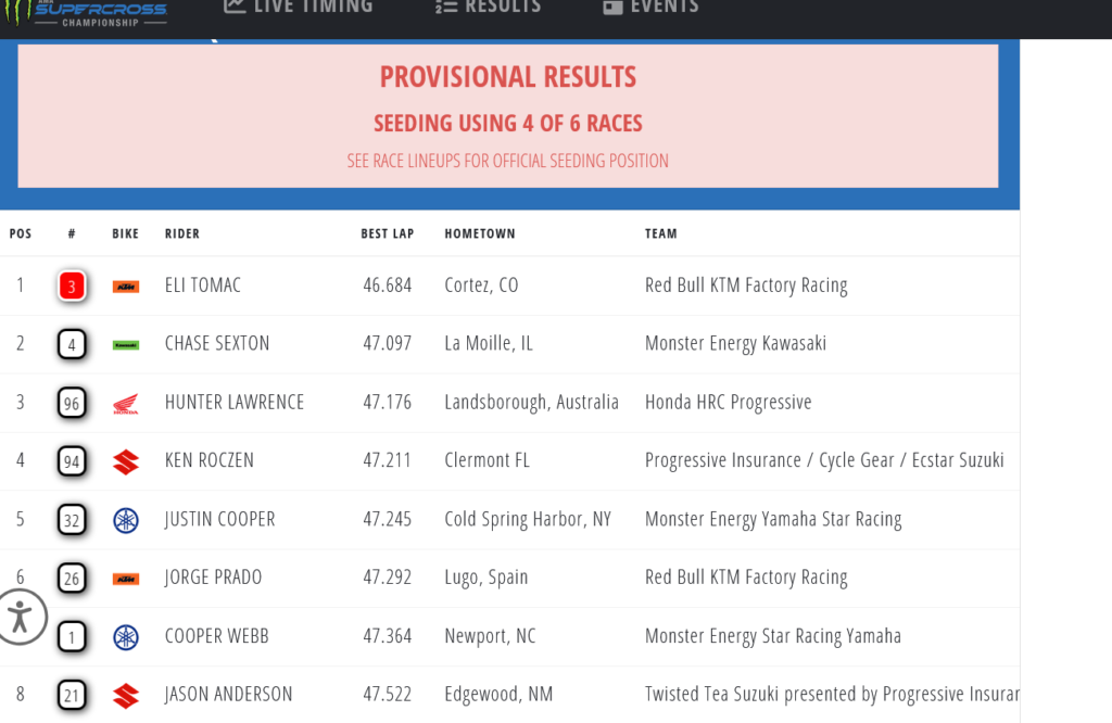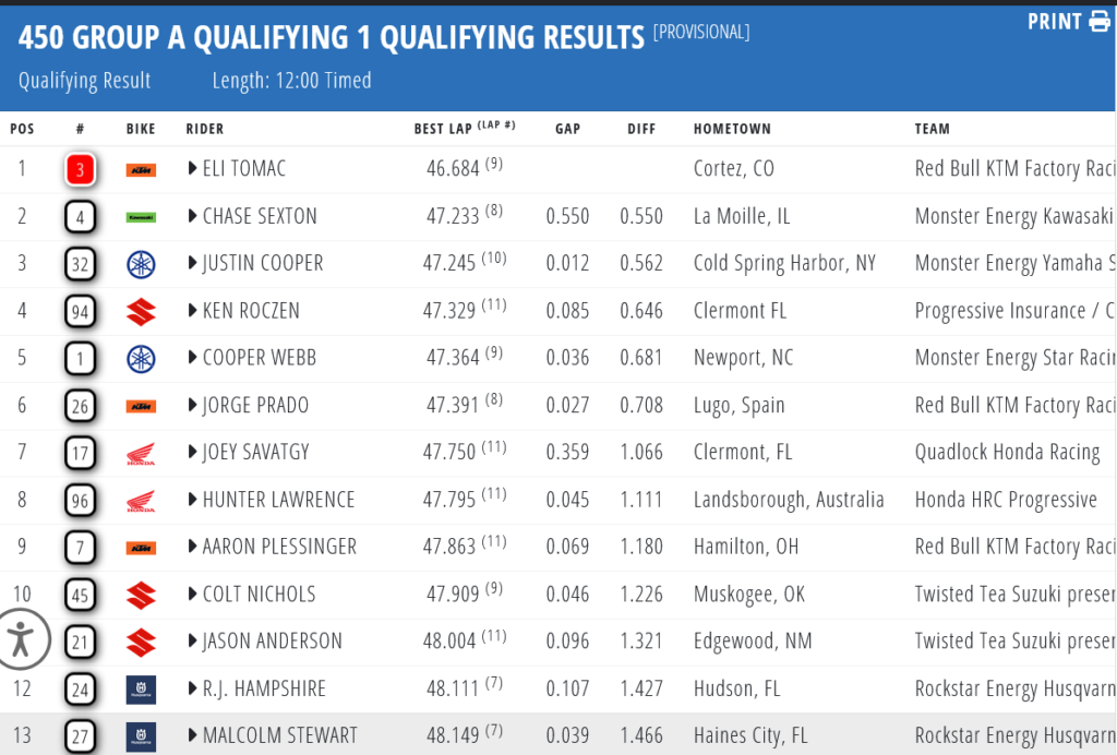 En la Q2 de 450, el más rápido ha sido Sexton, seguido de cerca por Tomac, Prado 5º