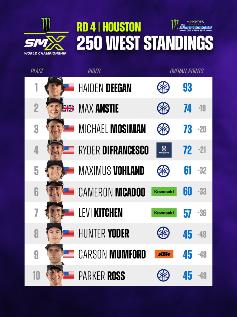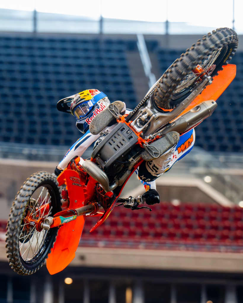 Aaron Plessinger: «La clasificación iba bastante bien en Houston, antes de que me golpeara el tobillo con fuerza en un salto. Tuve una buena salida en la primera carrera de la Triple Corona, pero luego cometí algunos errores y me quedé atrás; estuve muy involucrado en esas batallas de mitad de pelotón, que son difíciles. Y luego la segunda carrera fue muy parecida: simplemente no jugué tan bien como debía. Y luego, para la tercera, tuve una buena salida de nuevo y iba bien, pero entonces me empezó a doler el tobillo, lo que me hizo retroceder. En resumen, no fue una gran noche, pero nos centraremos en la próxima en Glendale para recuperarnos».