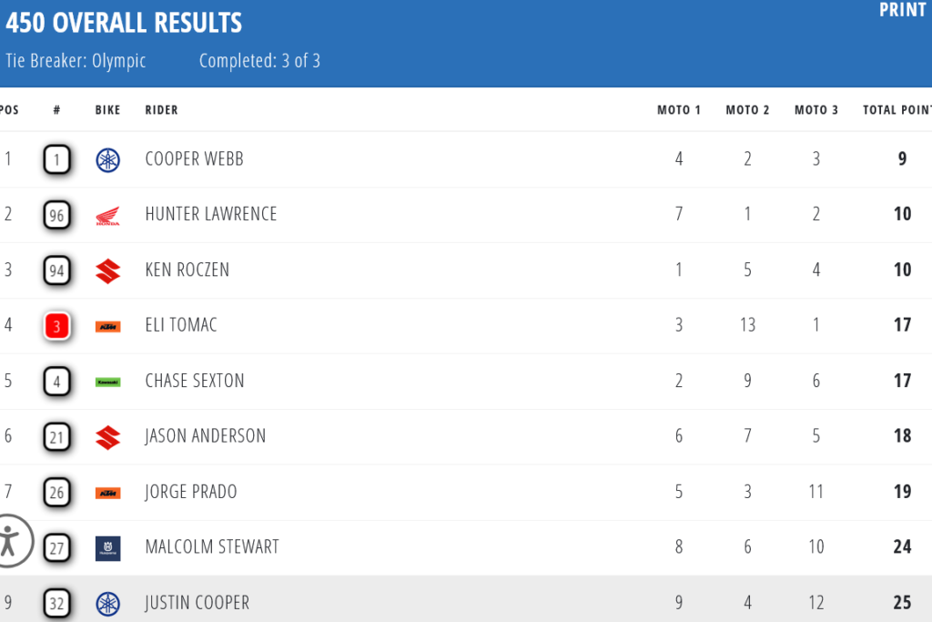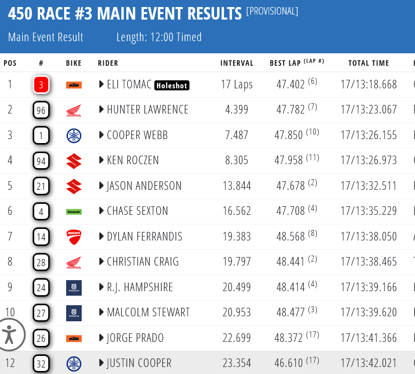 Eli Tomac: «Fue una carrera a toda velocidad, la triple, y en la caída en la transición, fue porque pise fuerte el freno trasero. Afortunadamente, pude pasar el manillar; pensé: ‘Vaya, realmente necesito pasar el manillar ahora mismo’. Sentí un poco el golpe de la moto, pero las extremidades están bien, estoy bien, y estoy emocionado de haber podido recuperarme en la última carrera. Si voy a perder una, esta es la que debo hacer, y estoy contento de haber quedado cuarto en la general, ¡porque fue una pasada! Me alegra pasar a la próxima semana»