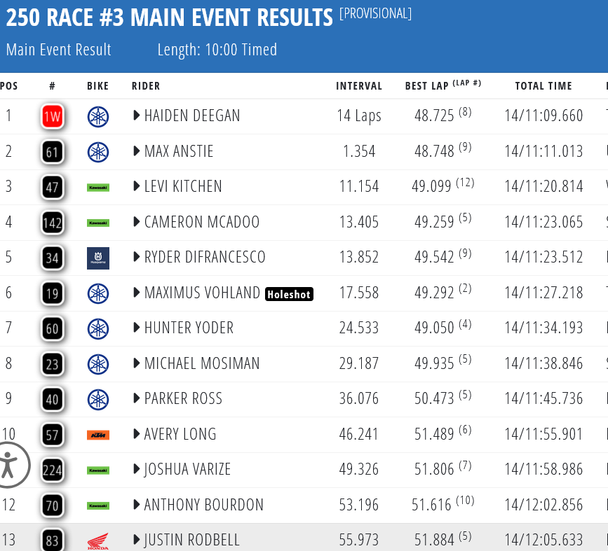 En la tercera final de 250 Vohland salía delante con Anstie, Deegan y Kitchen detrás. Kitchen adelanto a Deegan, cortándole el paso en una curva, pero Deegan se la devolvió pronto lo que aprovecho MaAdoo para pasar a Kitchen. Al final Deegan remontó y ganó, tres de tres.