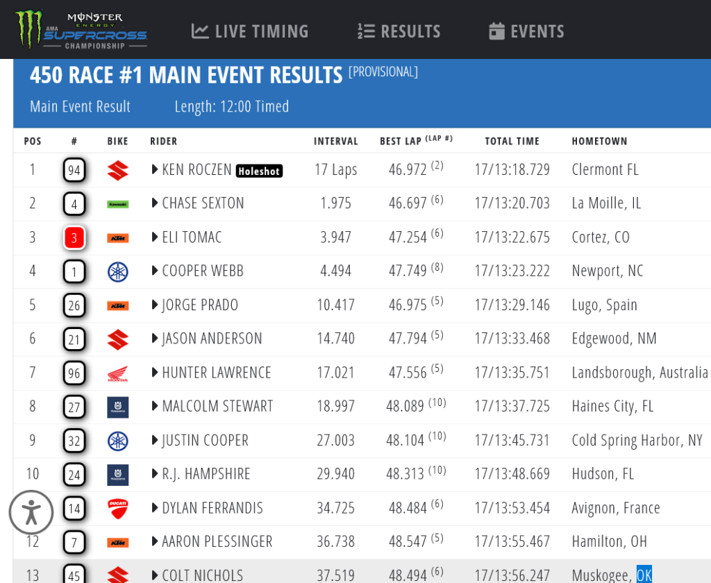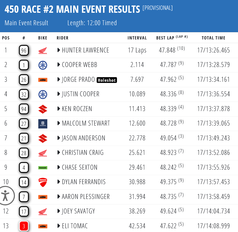 Tomac se situó primero, con Hunta y Ando detrás. Webb cometía un error grande y no pudo hacer el salto de meta, perdiendo algunas posiciones.