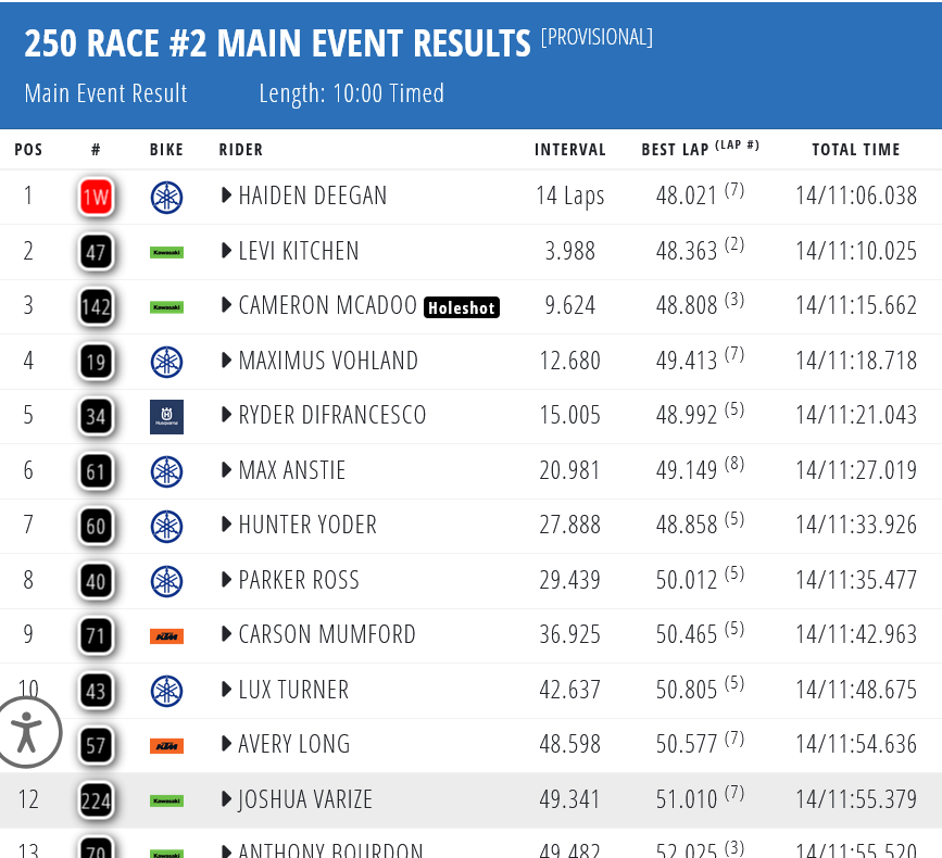 En la segunda final de 250 salían delante McAdoo y Kitchen, Deegan pronto se situaría detrás de ellos. Kitchen paso a su compañero de equipo y Deegan no tardaría en hacer lo mismo. A pocas vueltas del final Deegan atrapó a Kitchen y le cortó la trayectoria en una curva, al final una nueva victoria clara para Deegan.