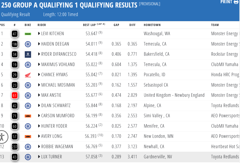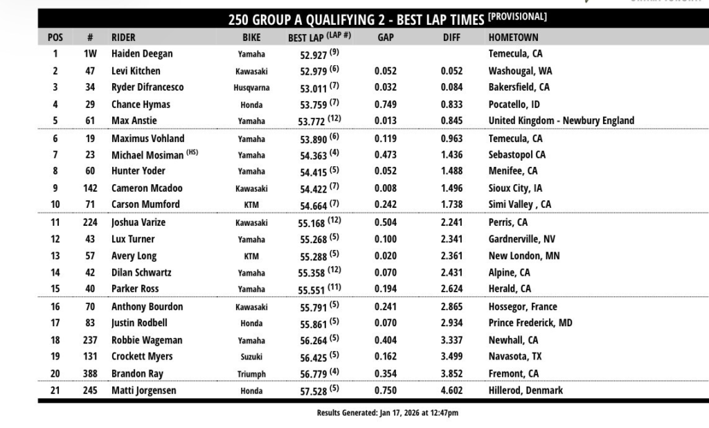 En la Q1 de 250 el más rápido ha sido Kitchen, único piloto en rodar en 53, Deegan 2º