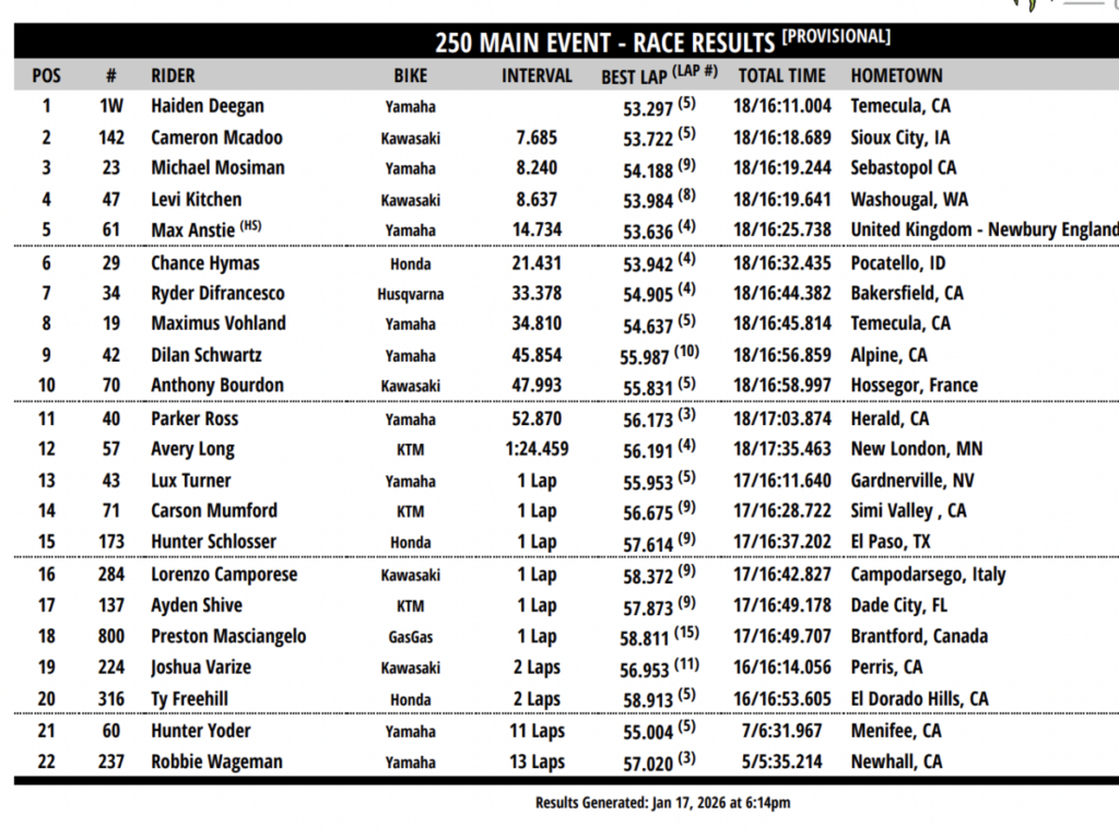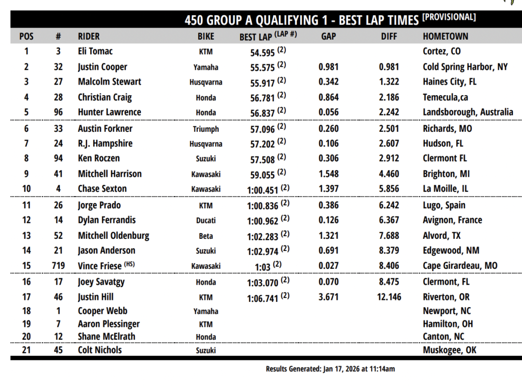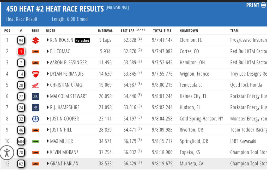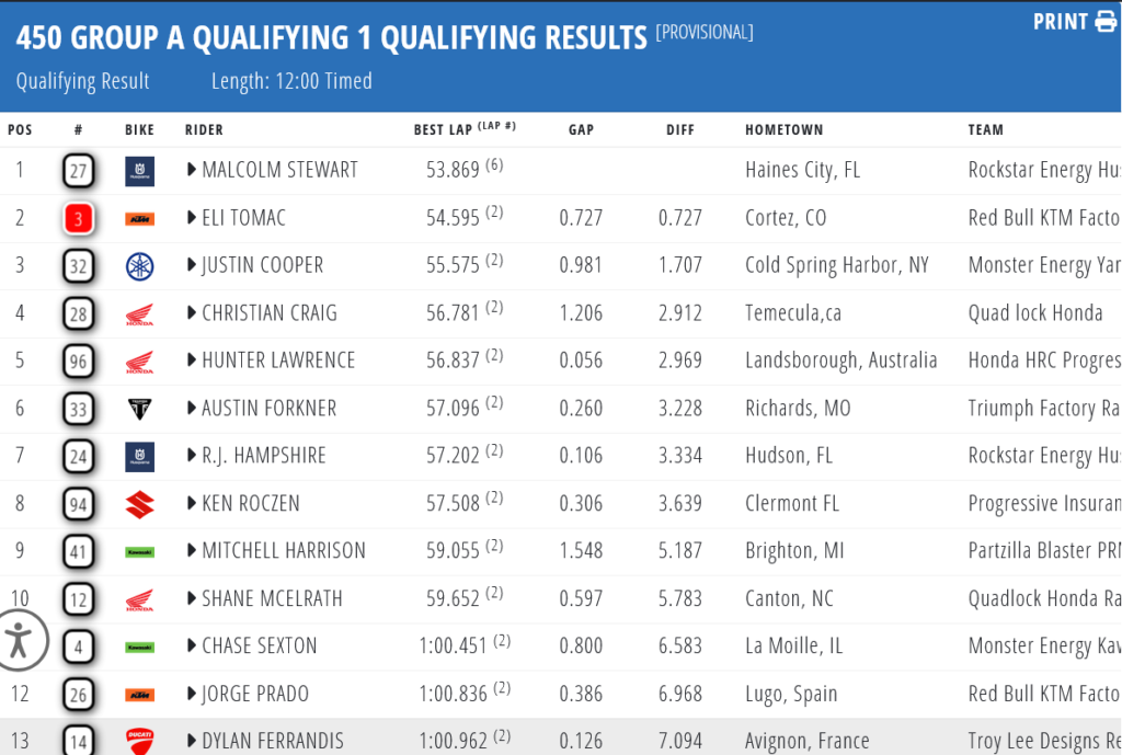La entrevista como mejor tiempo se la han hecho a Tomac, pero en la clasificación está Malc, lo dicho, problemas con el cronometraje.