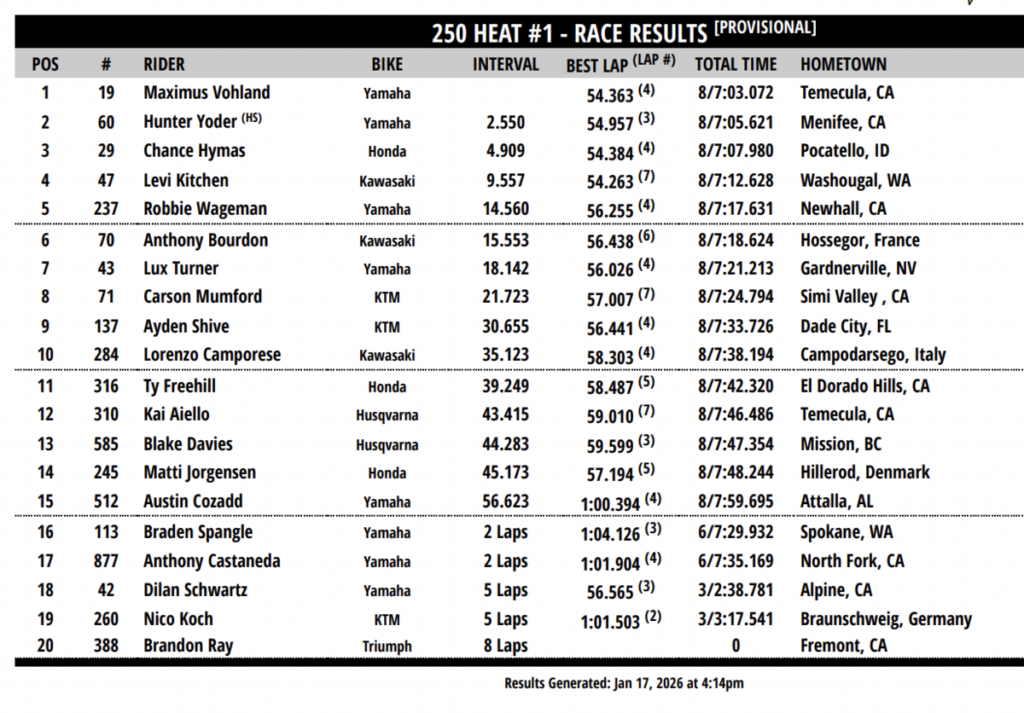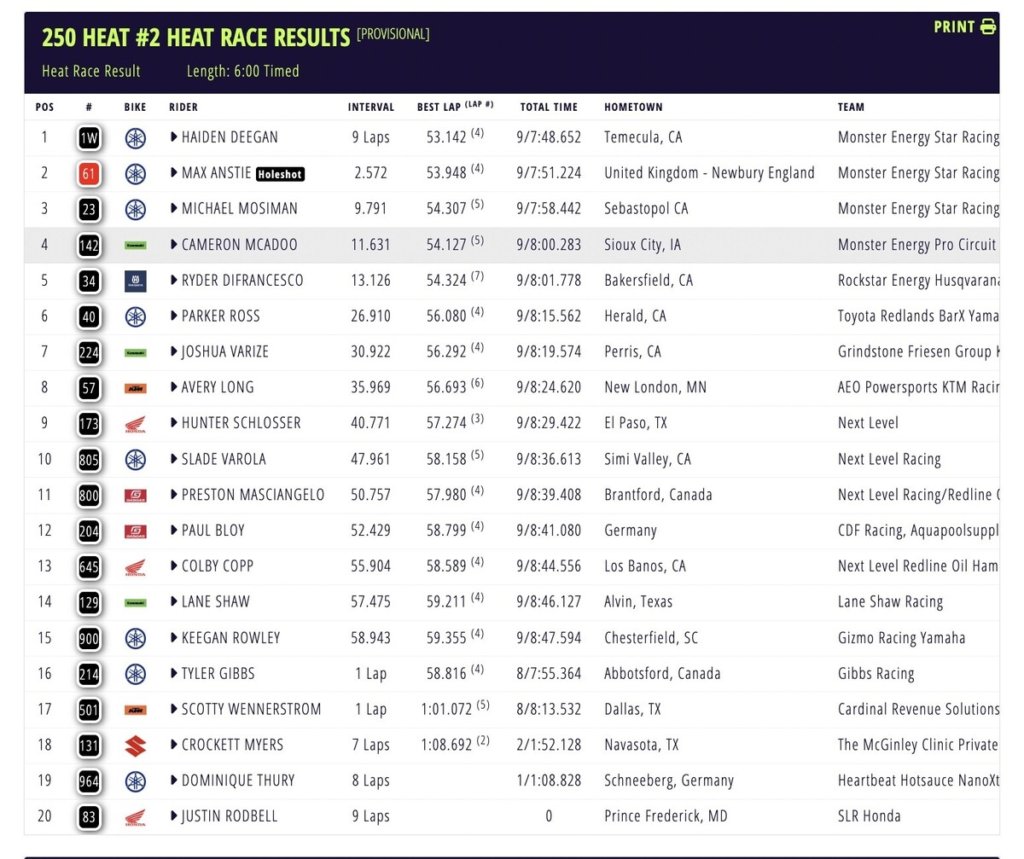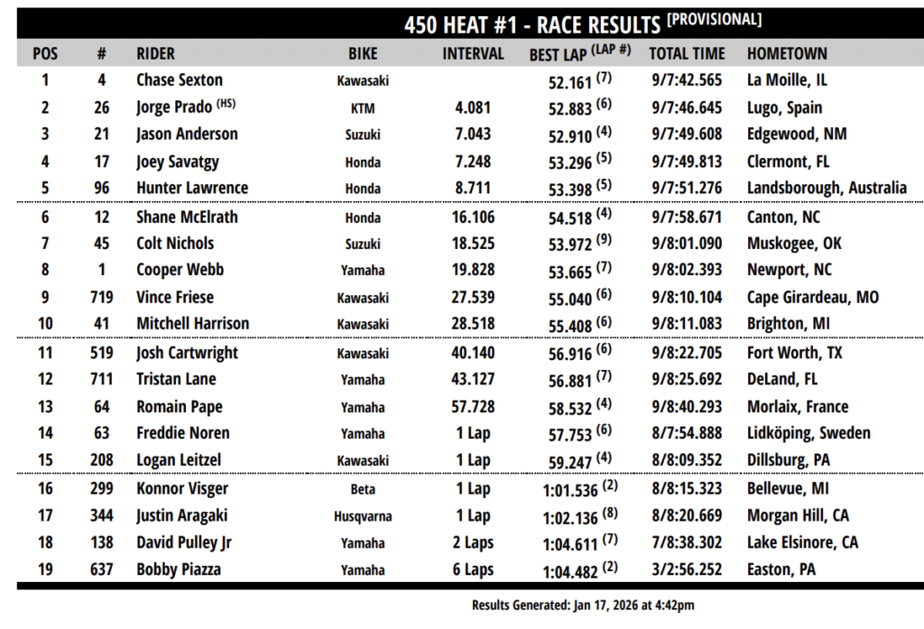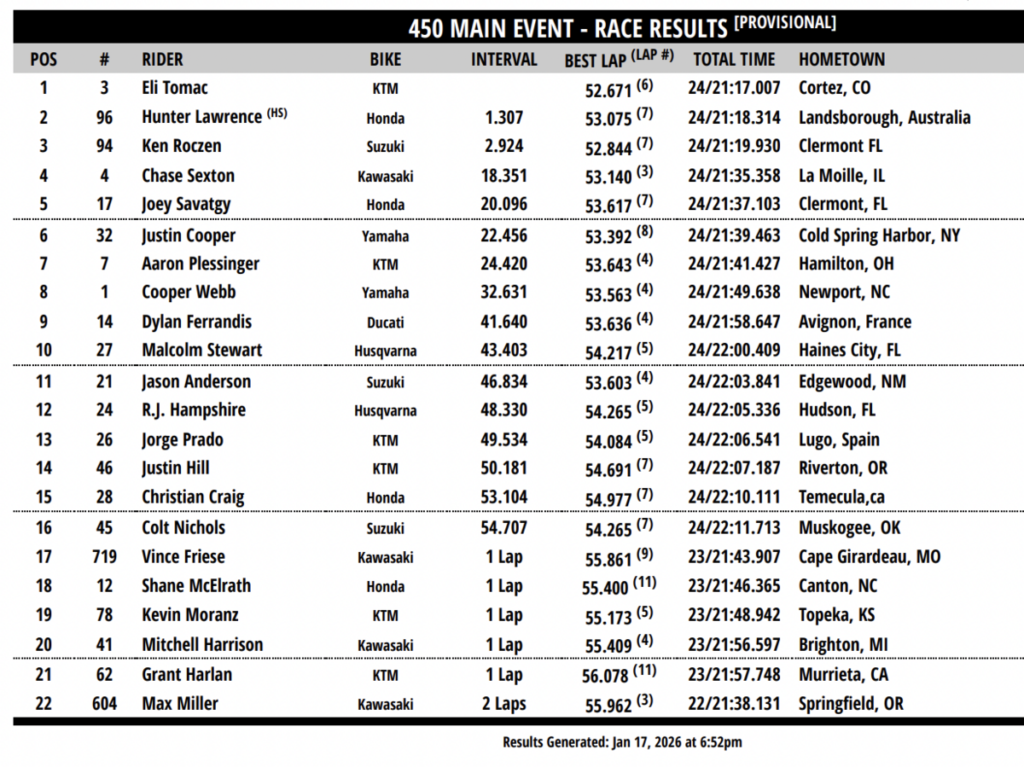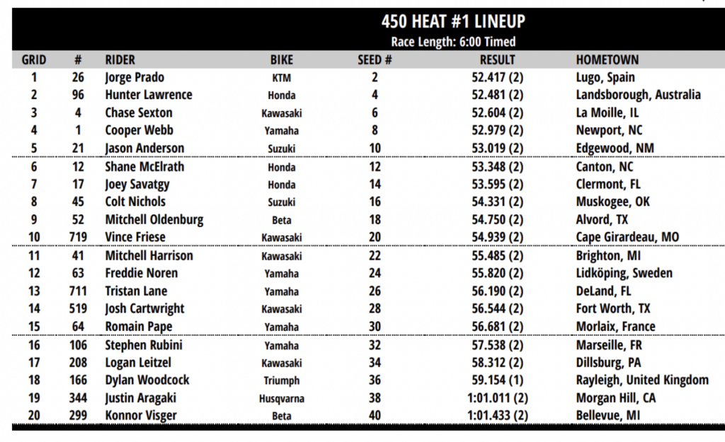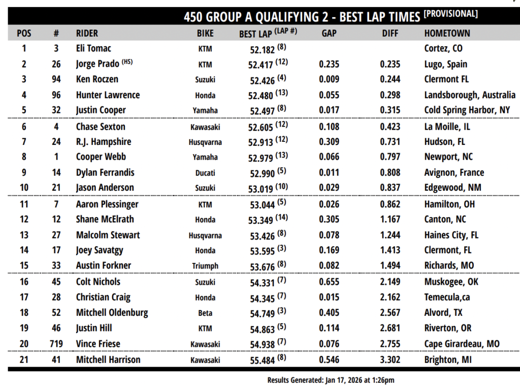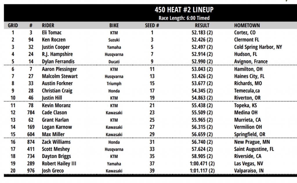 Tomac se colocaría segundo al cabo de unas vueltas, pero Roczen ya estaba lejos. Se muestran muy sólidos y rápidos Tomac y Roczen en este inicio de temporada. Los tiempos de vuelta rápida de estos dos similares a Prado, en 52 alto, Sexton hizo 52 bajo.