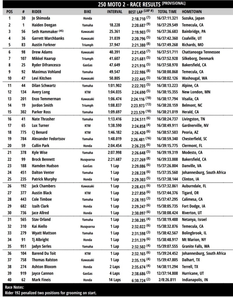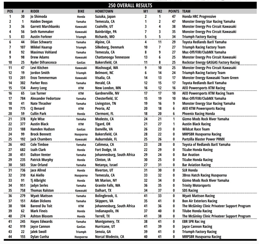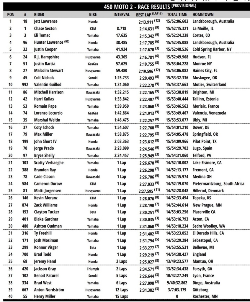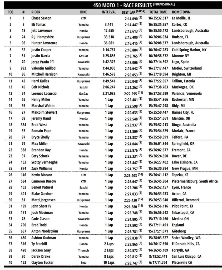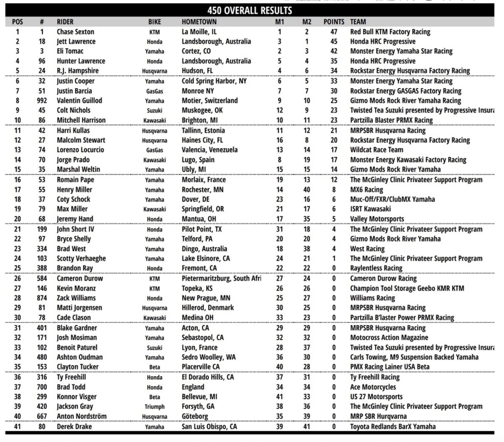 Al final las posiciones no se moverían, Jett gano la manga, Sexton la carrera. Podio; Sexton, Jett y Tomac